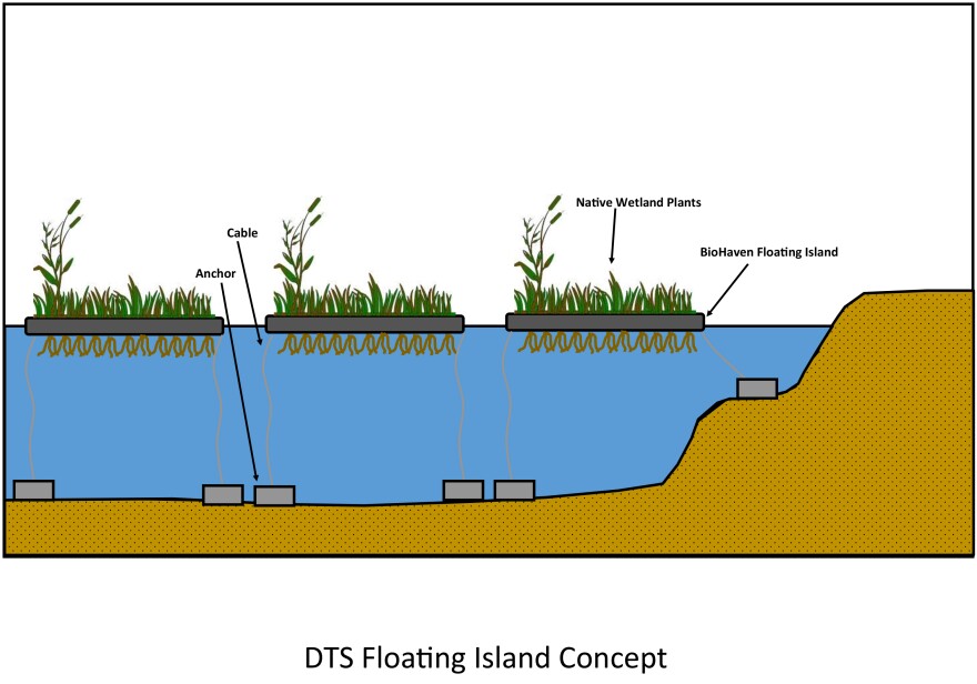 Winnen says they’re meant to do more than provide attractive habitat. “One of the challenges of an urban environment is fertilizer. If you get too much nutrients into wetlands you get algae. So the floating wetland islands, they have vegetation and as the roots grow down, they’ll actually will take nutrients out of the water and use them to grow the plants,” she says.