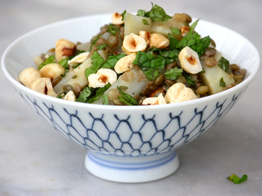 To serve cold, wait for the lentils and celeriac to cool down, then adjust the seasoning or add some more vinegar, if you like. Add hazelnut oil, mint and nuts in the same way as when serving hot.