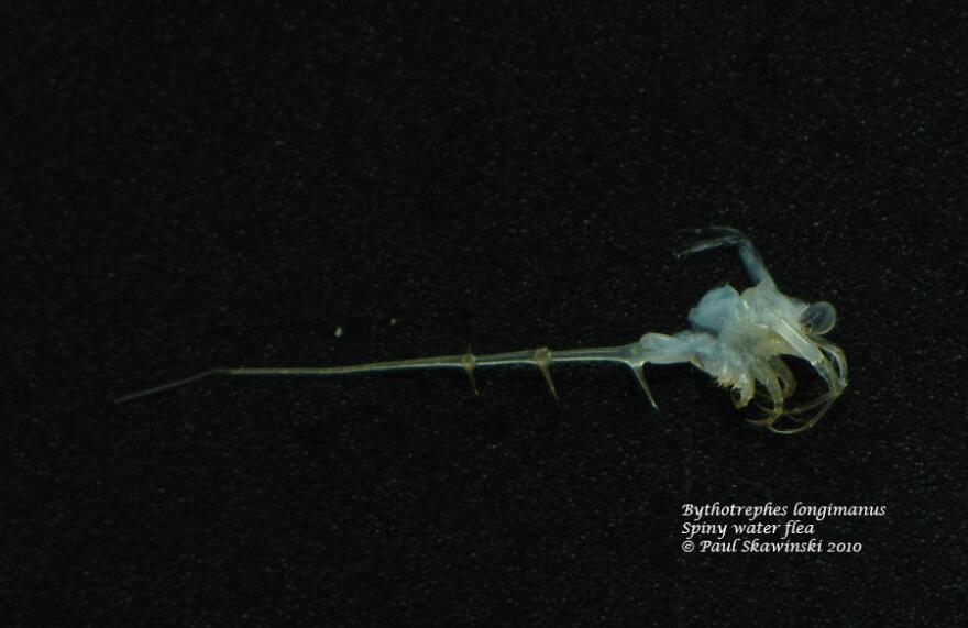 The spiny water flea is an invasive species about the width of a pinky nail. It has a long spiny tail, and several arms it uses to catch and kill other little crustaceans and zooplankton.