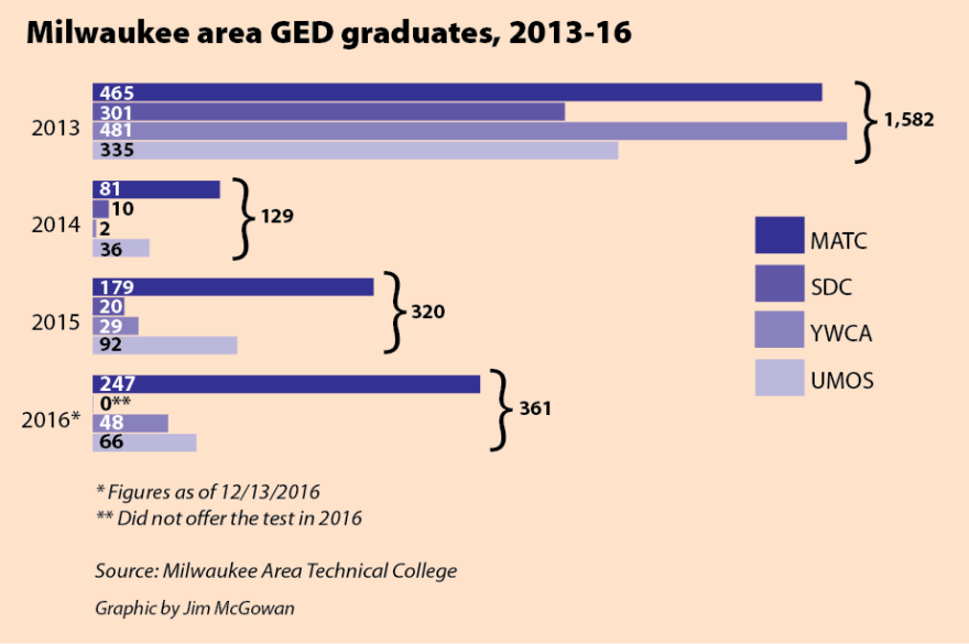 The number of GED graduates at Milwaukee’s main test sites plummeted beginning in 2014, the year a new GED test — a computer-based exam that focuses on higher-order thinking — was adopted across the nation. Still, educators agree that the new test assesses the skills that are needed to succeed in today’s workplace, and the passing rate has improved — from 47 percent in 2014 to 72 percent in 2016.