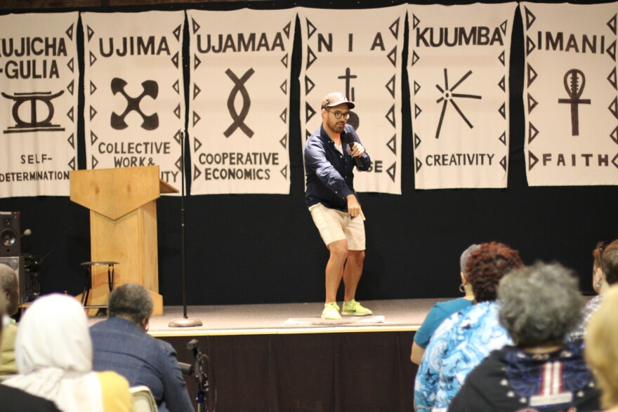 The Doors Open StorySlam in June of 2016 had our second teller, Adam Carr, describing a very physical conundrum he faced while participating in a “Temporary Resurfacing” art and video installation on Mitchell Street. Adam was projecting his video onto the side of a four-story building, from the top of a one-story Somali grocer. After shimmying down the fire escape and across a ledge that required a solid-footed “swivel,” he discovered that the only way to make his setup work was to use his shoes to prop up the projector. One problem: he needed his shoes to get off the building. His video was projecting perfectly but he was stuck alone on the grocery store’s roof for five hours. Would anyone be able to help him escape?