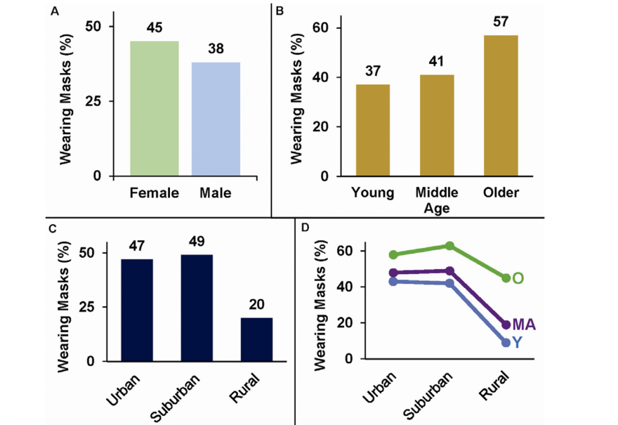 As for location, suburban and urban areas are wearing masks at about the same rate but rural areas are wearing masks at less than half the rate of suburban and urban communities. While higher population density can make transmitting COVID-19 easier, that does not mean rural communities are safe.