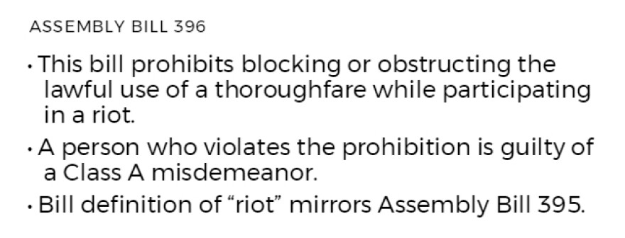 A second measure would instruct police to arrest people who block thoroughfares during a riot. The third bill would charge people with a felony, if they carry weapons while participating in a riot.