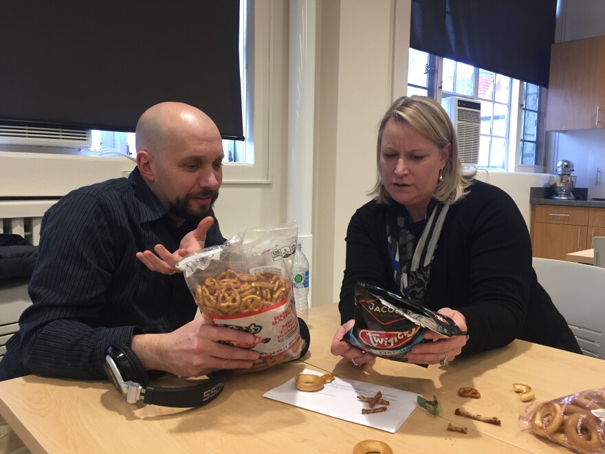 Mitch Teich and food scientist Anne Vravick trying to determine if the snacks they are eating are, in fact, pretzels.